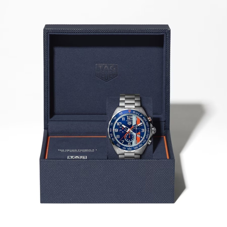 Pensé pour correspondre parfaitement à la TAG Heuer Formula 1 Gulf Edition, cet écrin unique constitue l'endroit idéal pour conserver ce bijou.